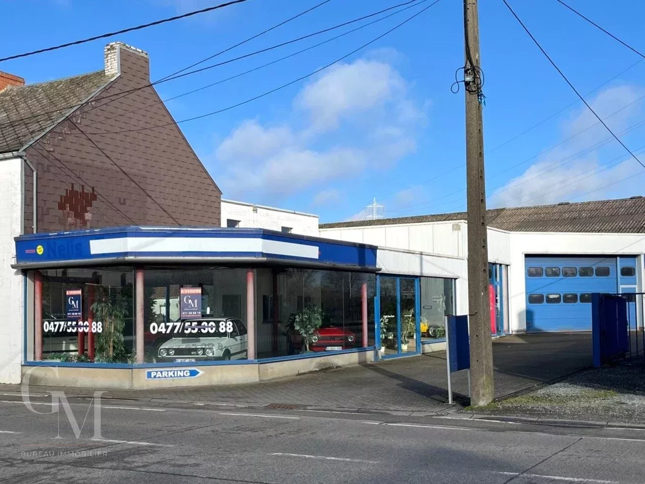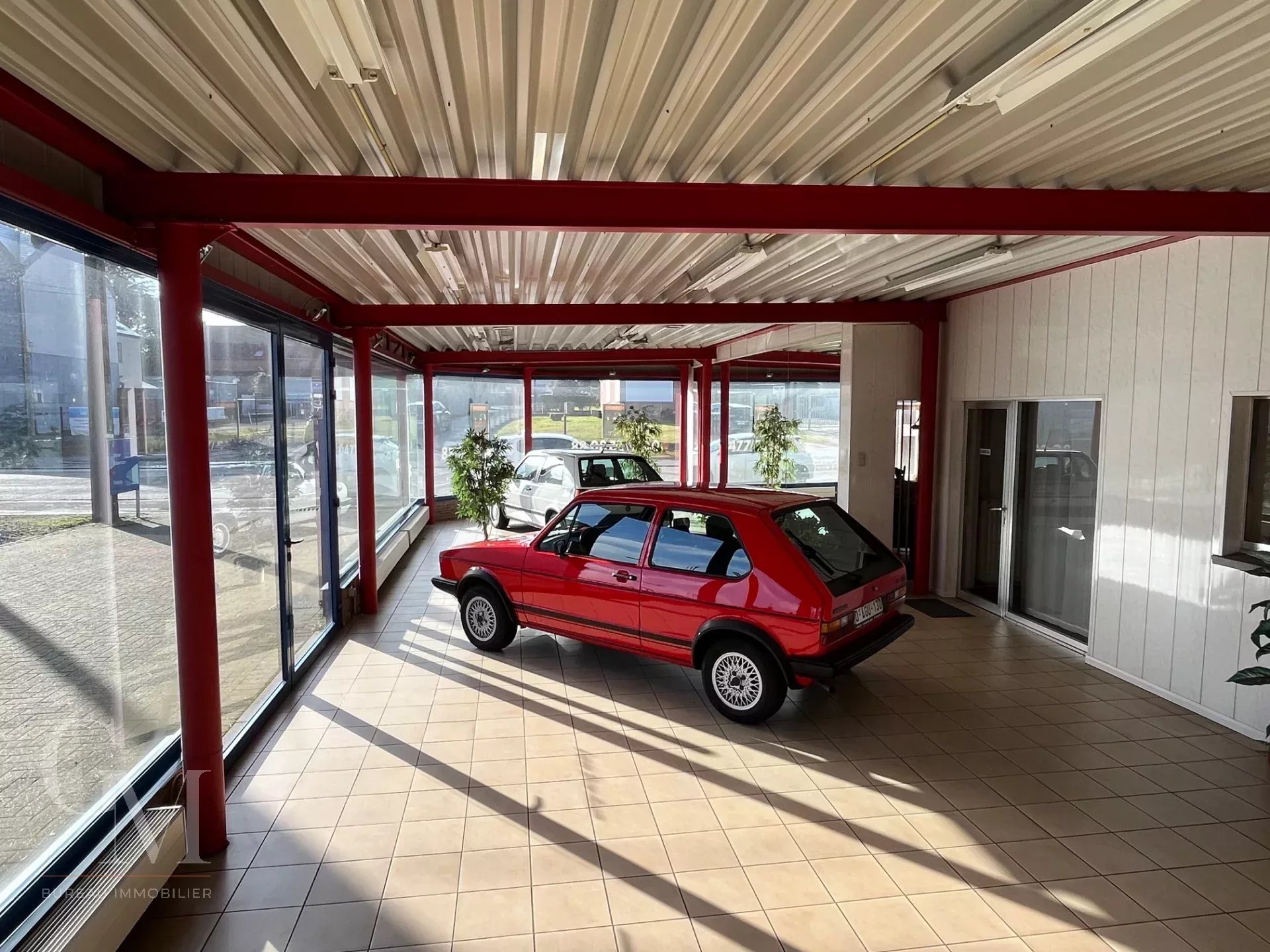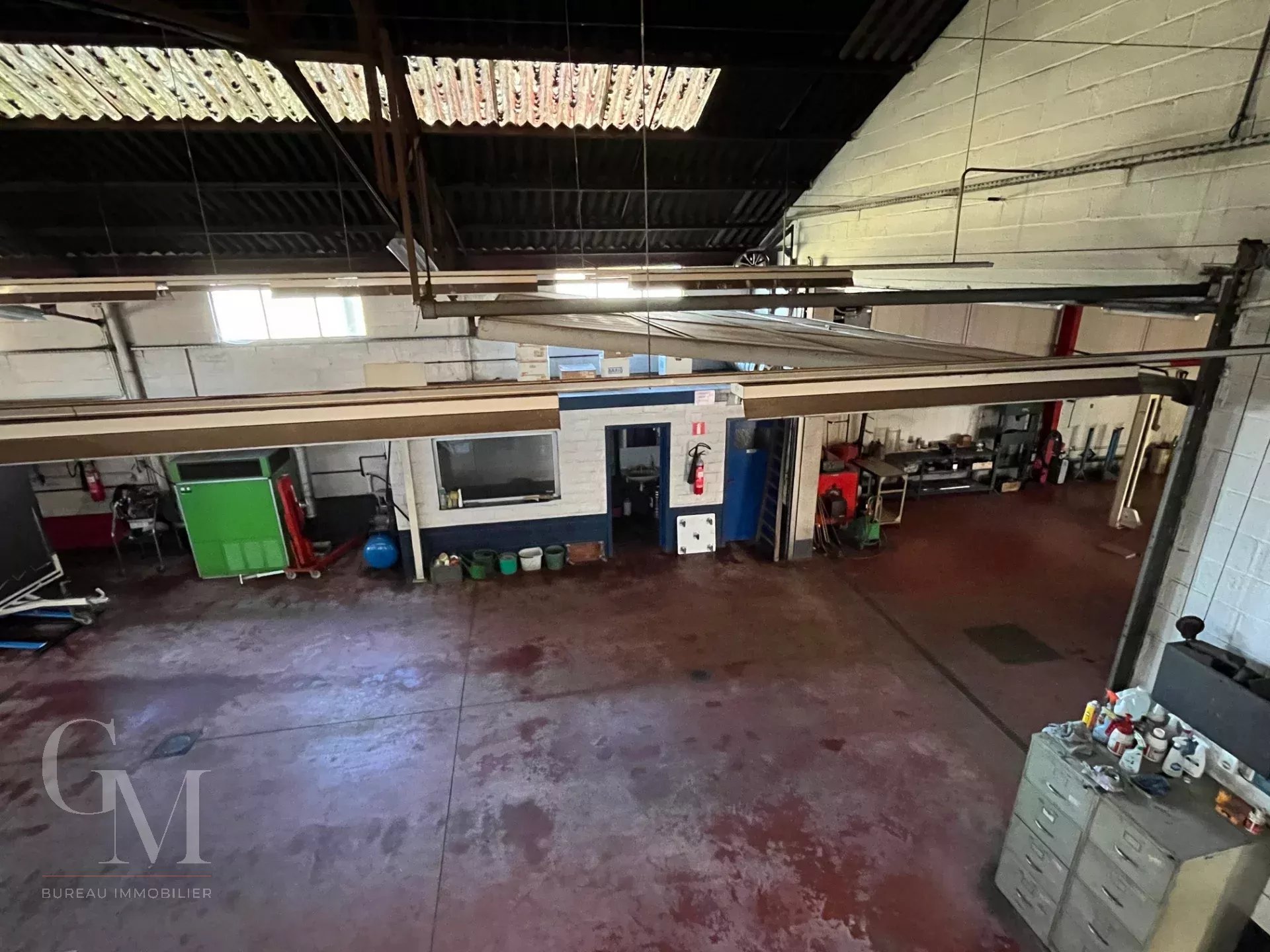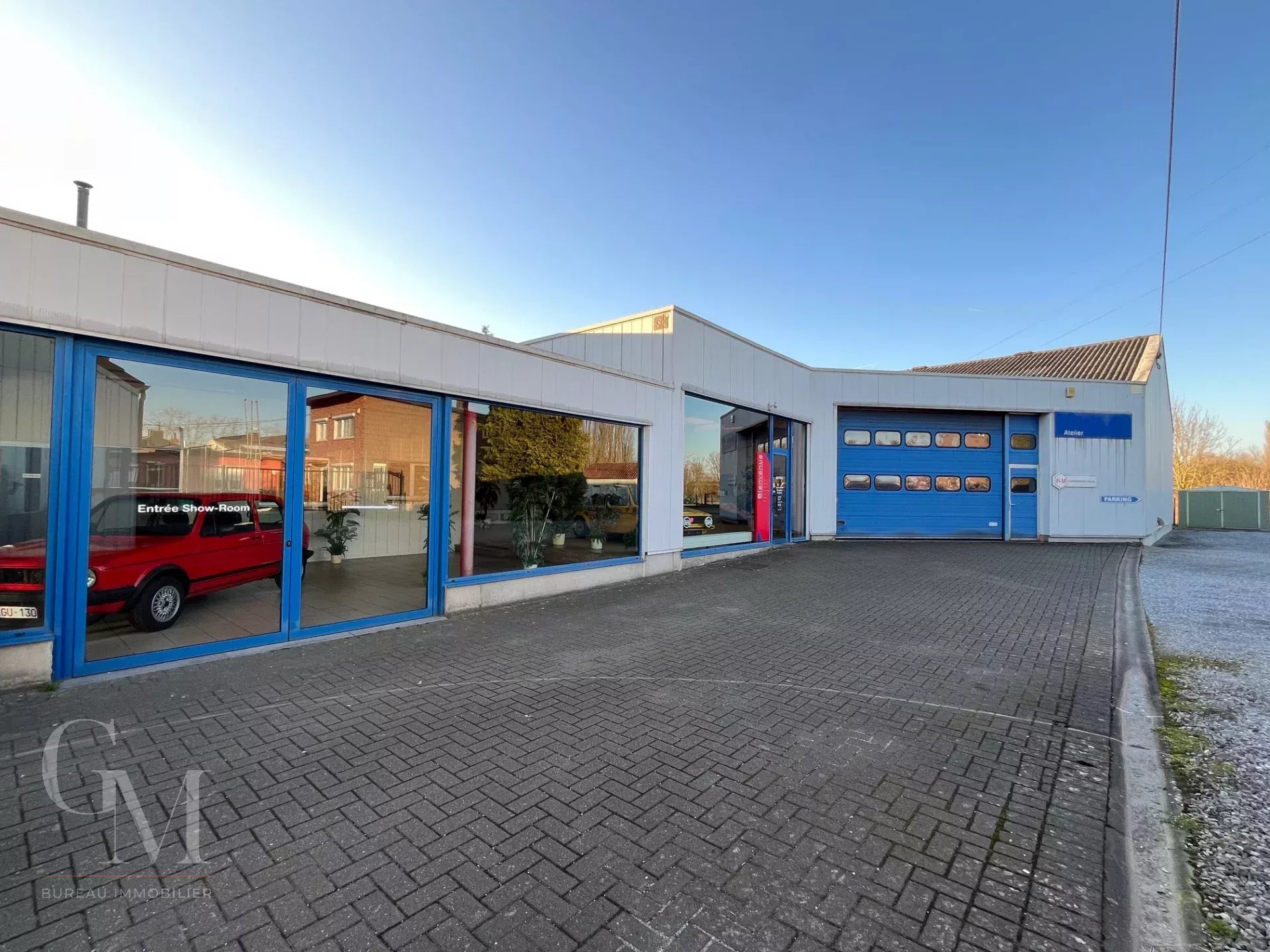 Garage with showroom: +/- 980 m² including the showroom, reception area, offices, two mechanical workshops, a warehouse with paint booth, a store, and an annex;