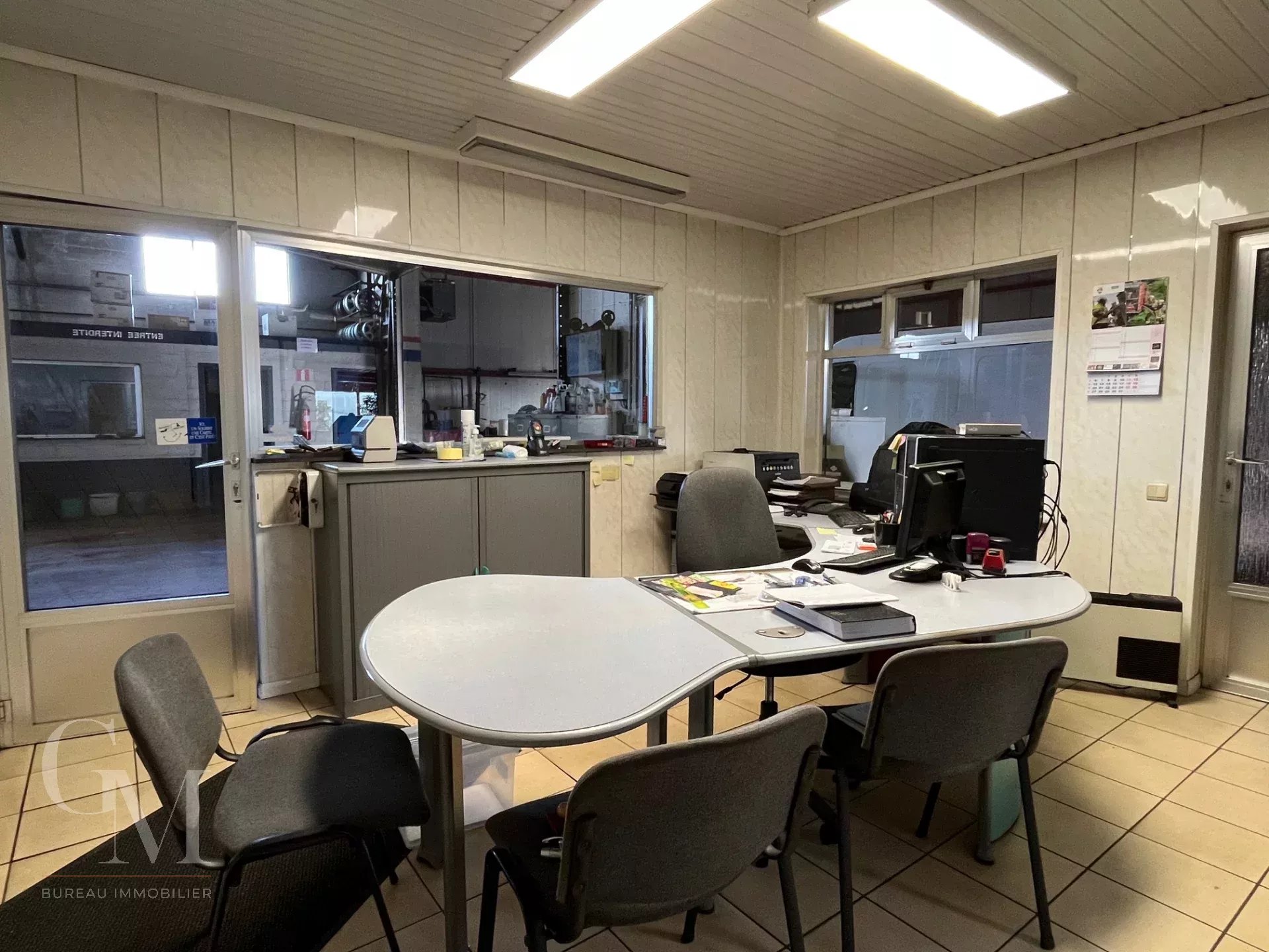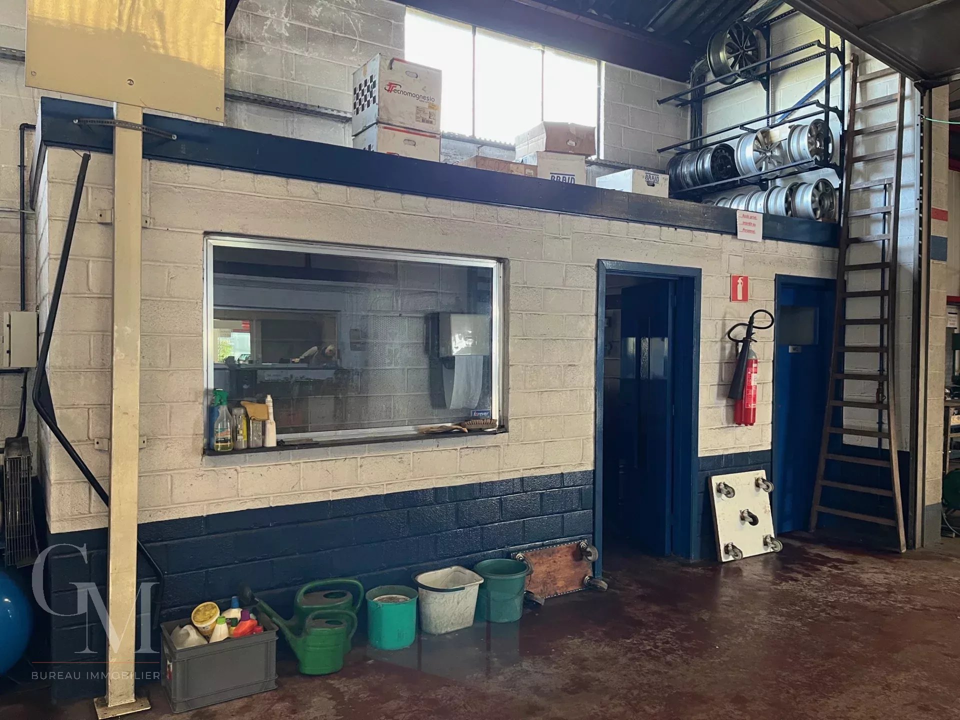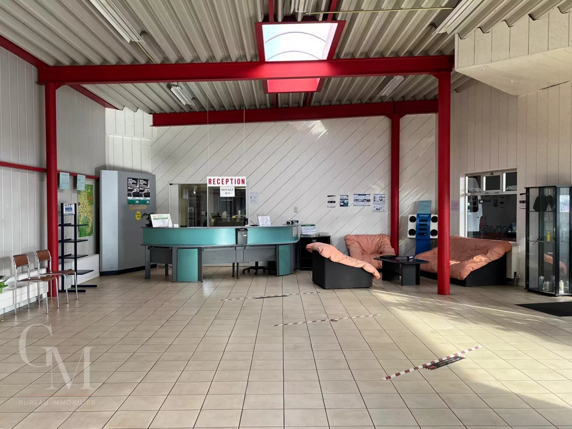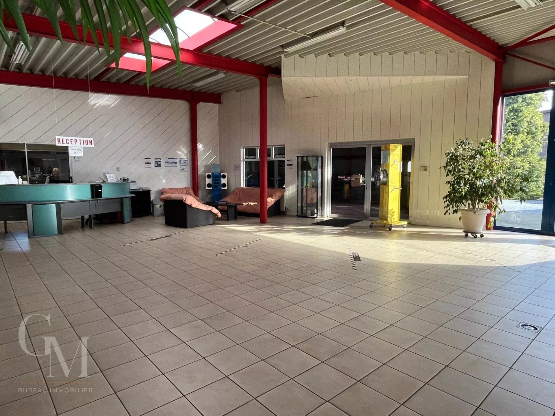 Garage with showroom: +/- 980 m² including the showroom, reception area, offices, two mechanical workshops, a warehouse with paint booth, a store, and an annex;