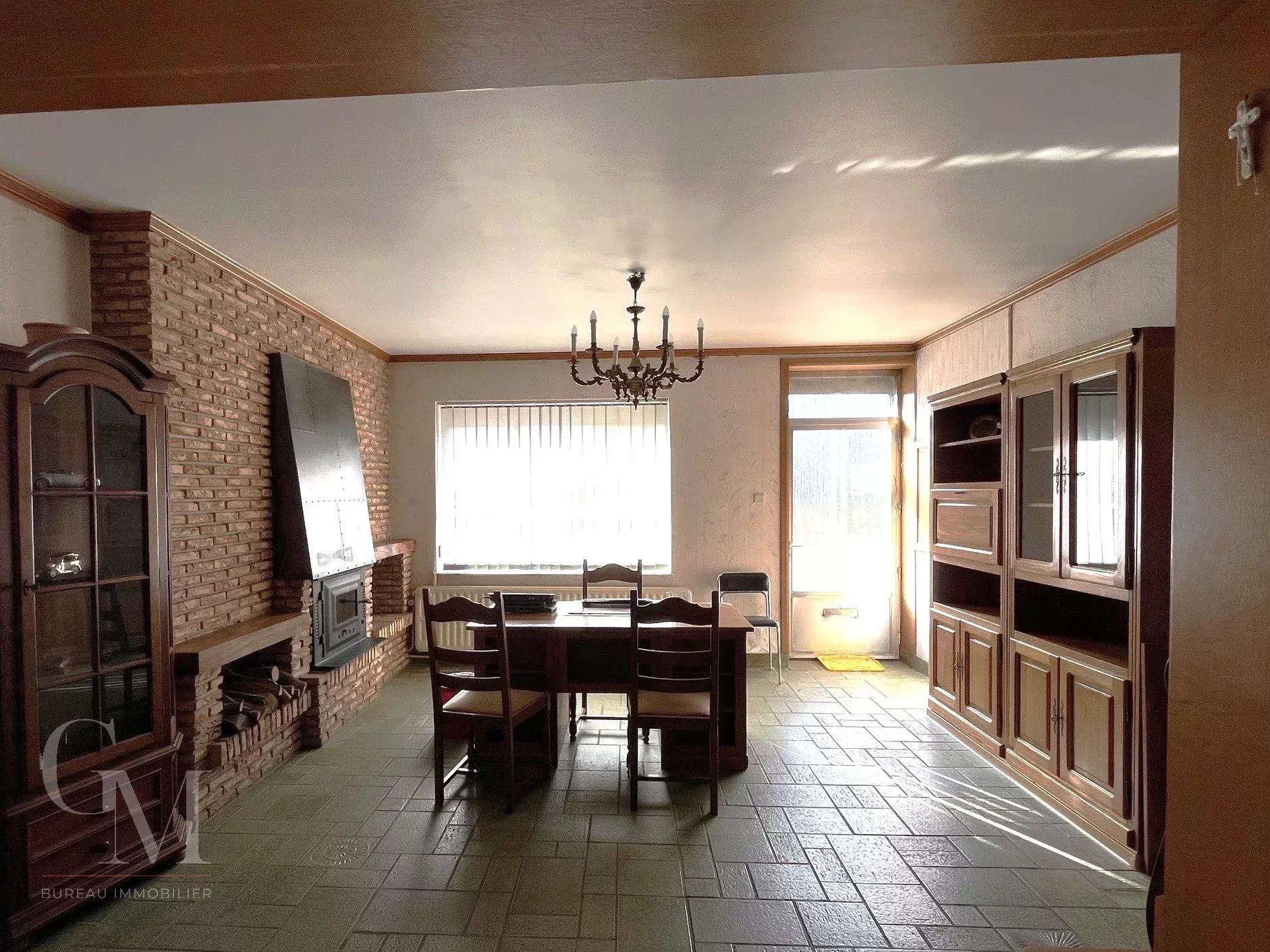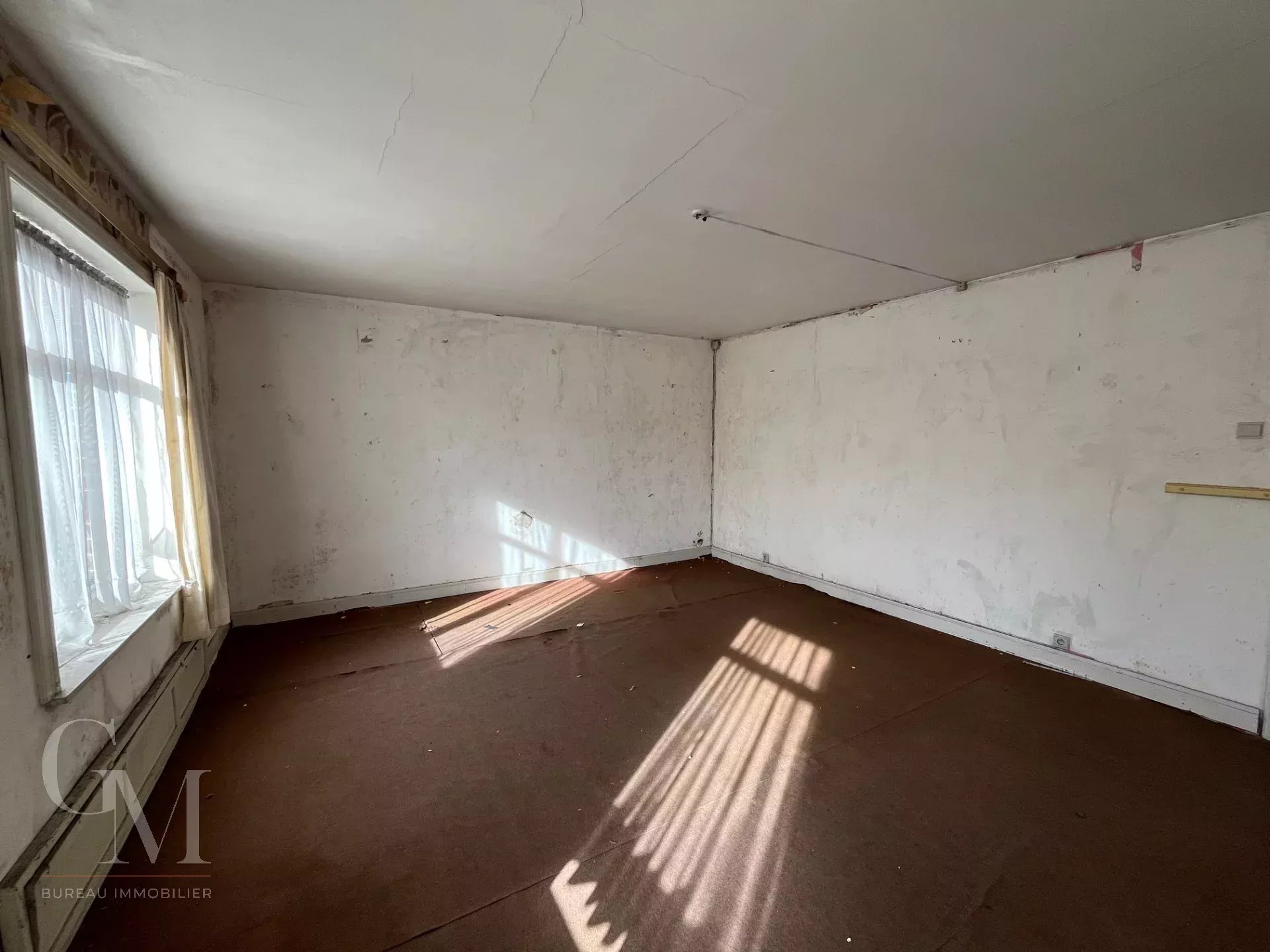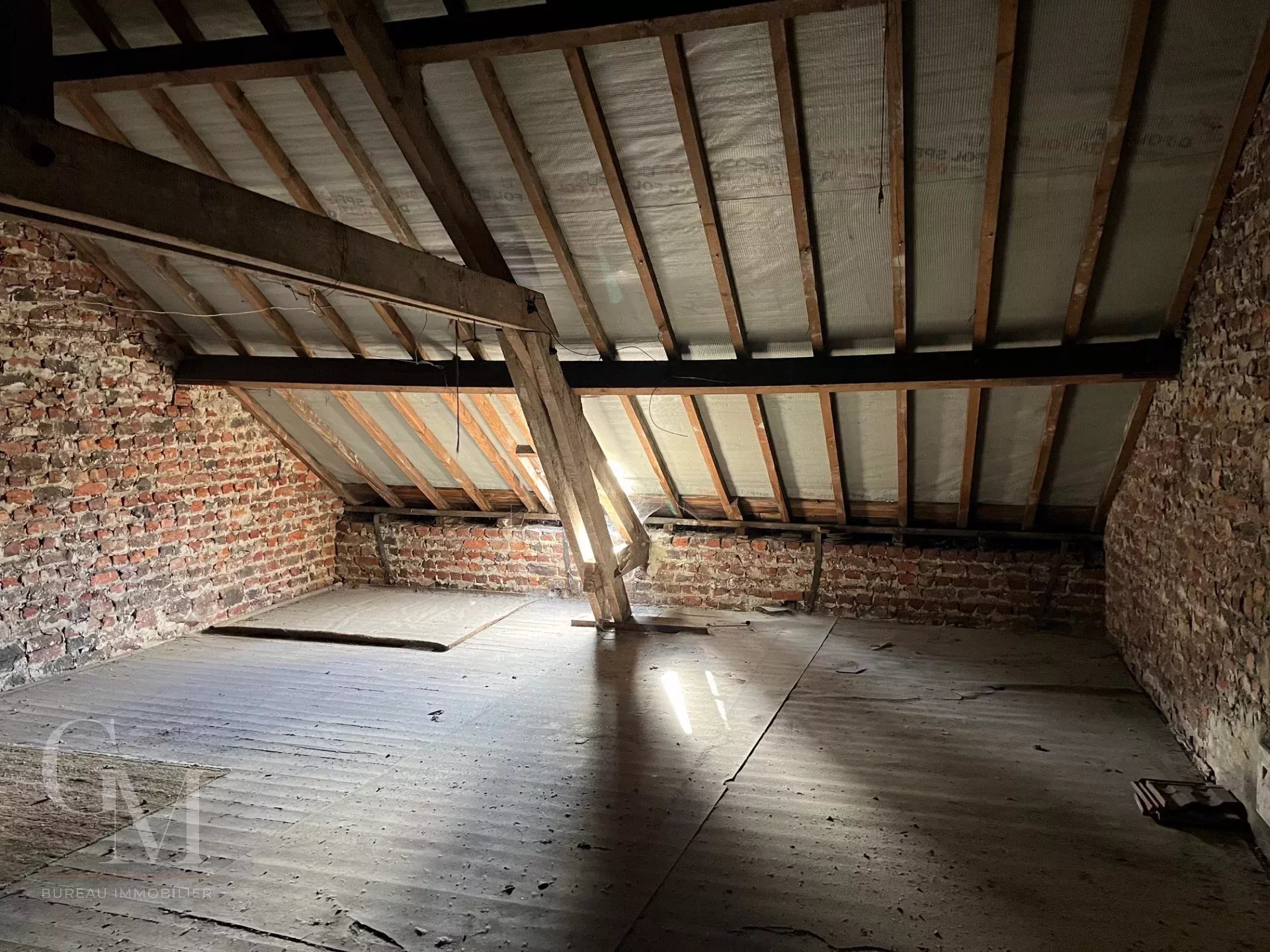 Adjoining house: +/- 110 m² of living space to be refreshed, comprising a ground floor converted into offices, upstairs: two bedrooms + bathroom, an attic, and a cellar. Oil-fired central heating.