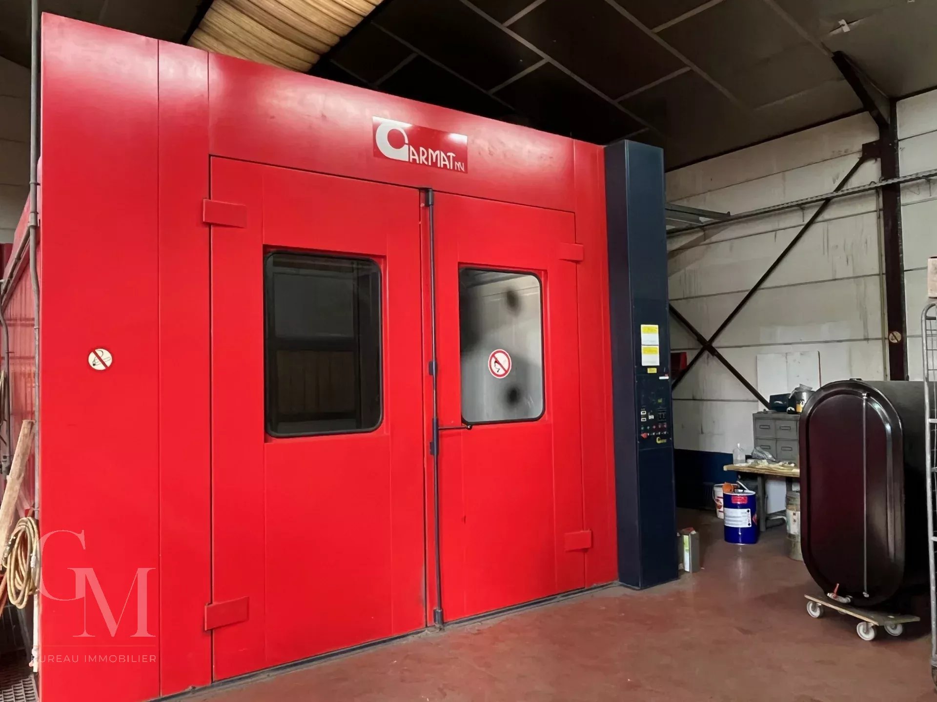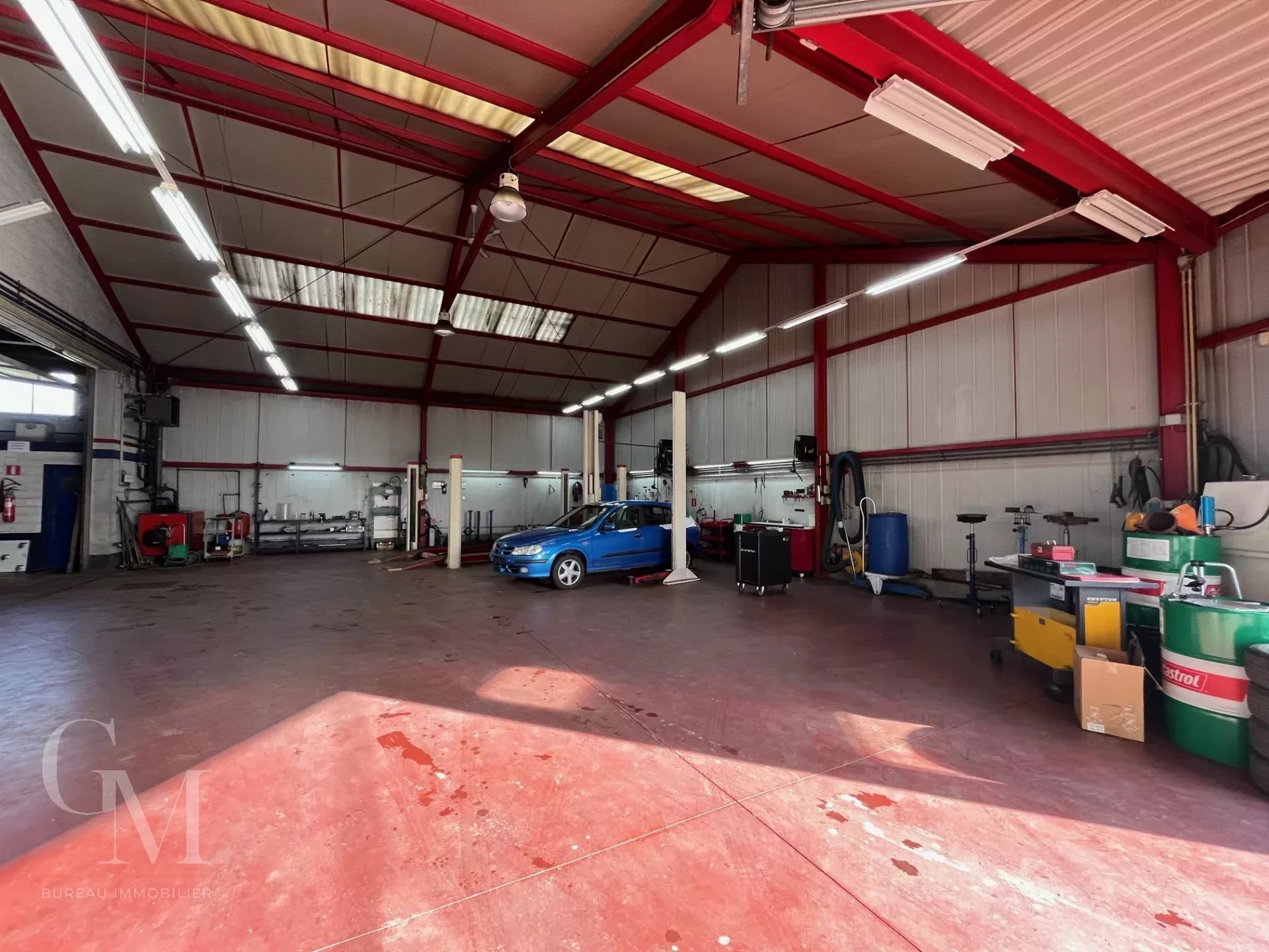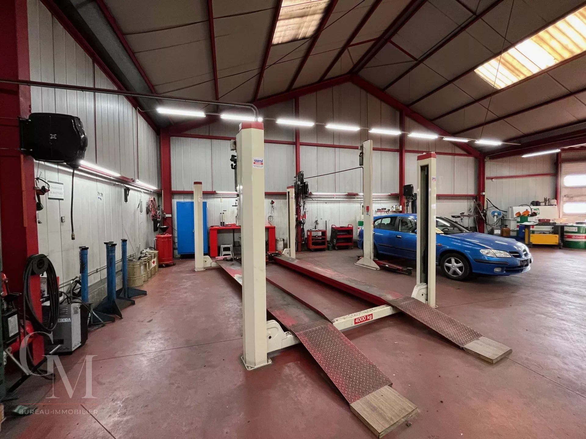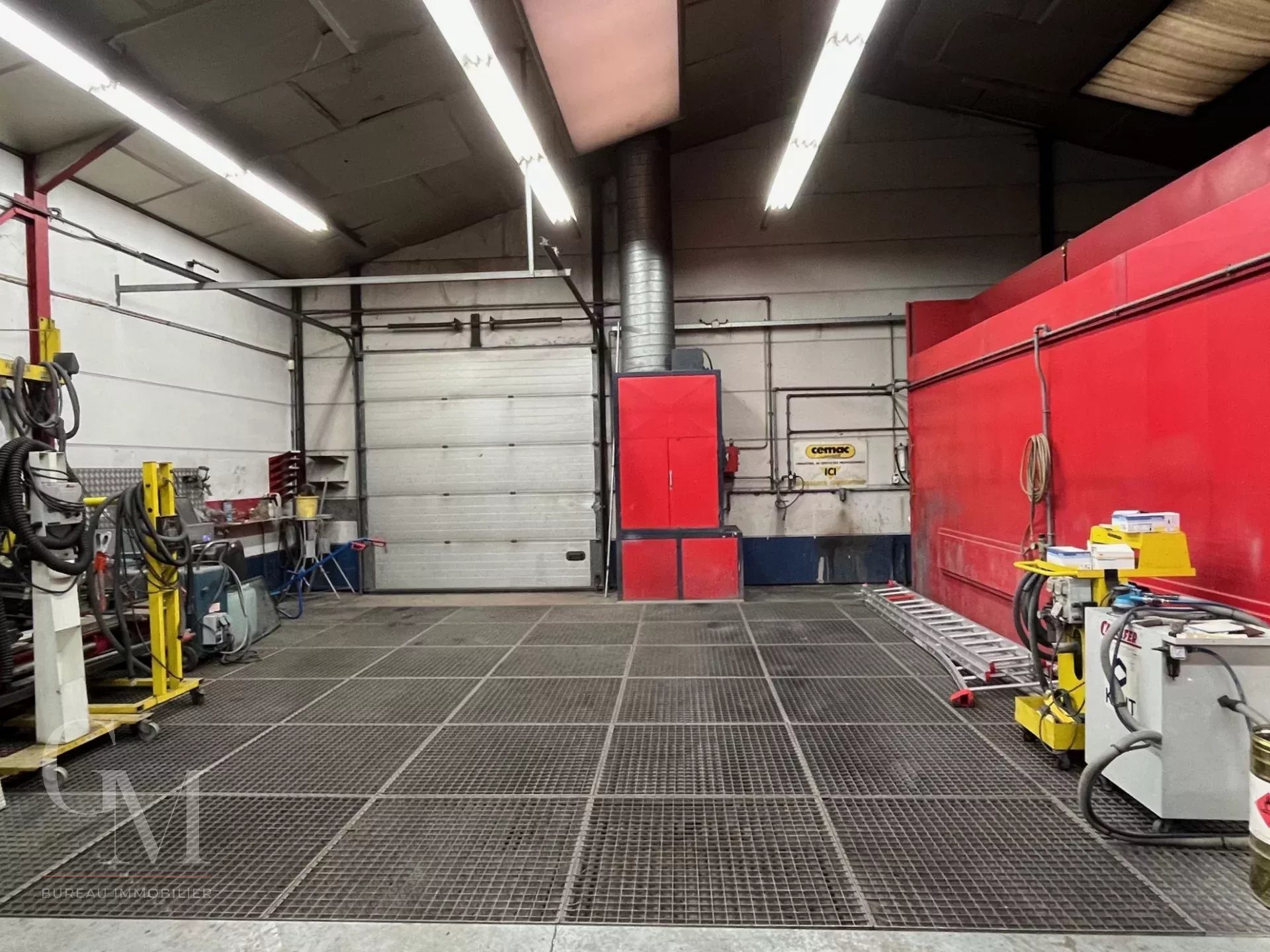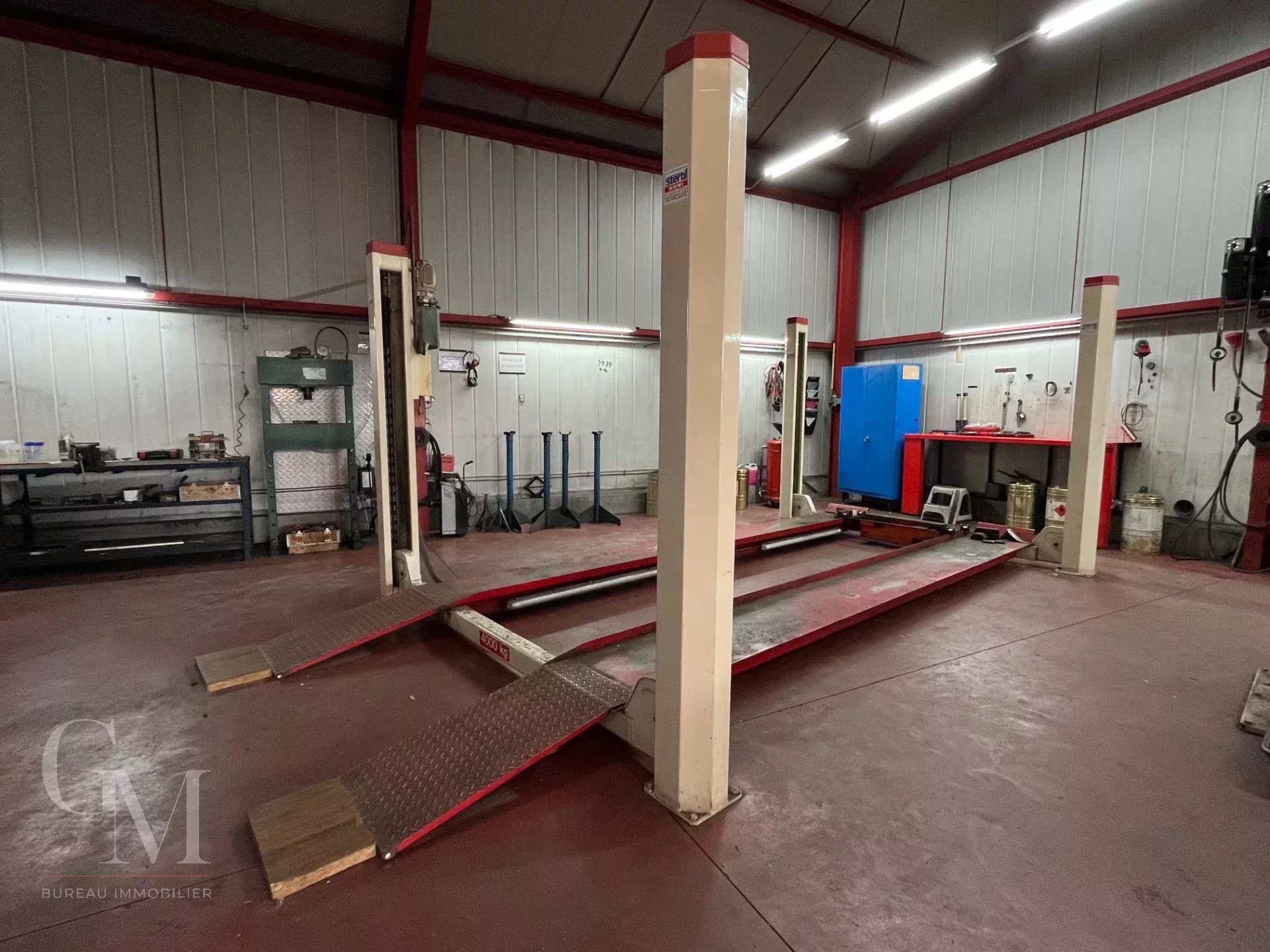A paint booth + lab, two lifts: 2 columns 2,500 kg and 4 columns, 4,000 kg, alarm system, sectional door, various tools, etc., all in good condition and operational.